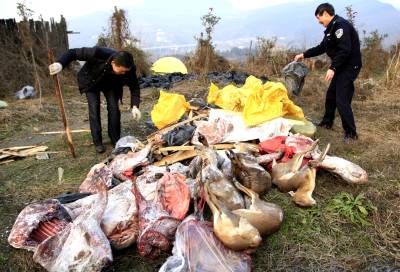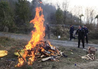 1月14日,竹山县在该县文峰乡境内销毁一批野生动物死体。春节临近,竹山县森林公安局启动“2016一号专项行动”,联合公安、工商等部门对非法捕猎和经营野生动物及其产品违法犯罪活动进行集中整治,坚持集中整治、重拳出击、主动作为的原则,严厉打击破坏野生动物资源违法犯罪行为,为野生动物繁衍创造优美的生存环境,并取得明显成效。目前该县集中行动20余次,出动人员70余人,收缴野猪胯子、小麂胯等死体489斤,刑事案件4起,行政案件3起,拘留1人。(视界网程平 摄影 )