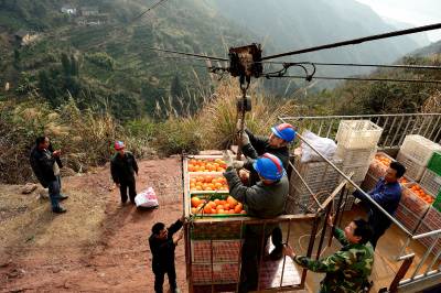 1月14日,胡学平正在电力工人的帮助下卸载从对面悬崖上运输过来的第一车柑橘。