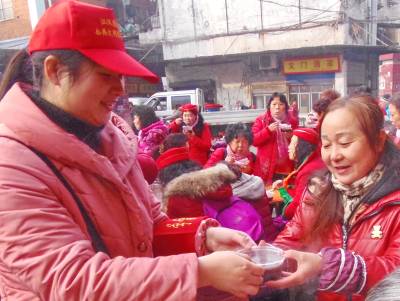 在"腊八节"前夕的1月15日上午9点多钟,武汉市江汉区唐家墩街陈家墩社区举行了"和谐邻里情浓情腊八粥"为主题的幸福家园活动,来自社区的群干、"城中村"改造搬迁远方的居民、华南海鲜市场的农民工和过往行人,慕名踏至。在喧天欢乐的锣鼓声中,欢聚一堂,喜气洋洋,共品冬暖人心的腊八粥,共叙幸福家园邻里情。在不到半个多小时的时间里,数百名美食客,将约90公斤5大桶的腊八粥,品味一空。