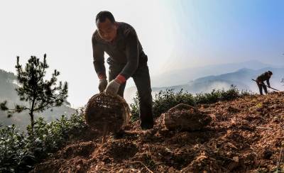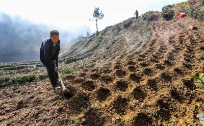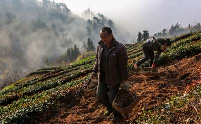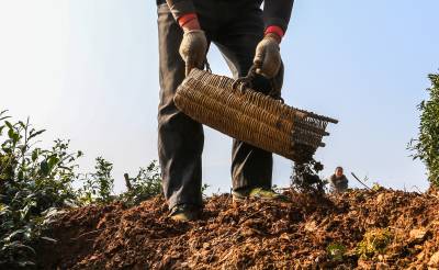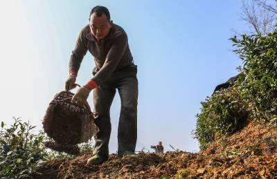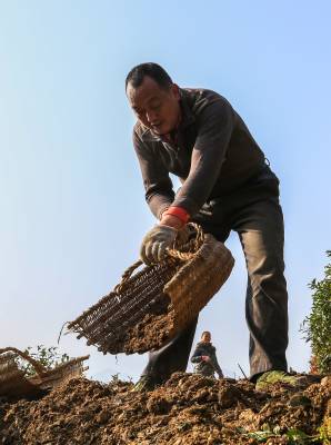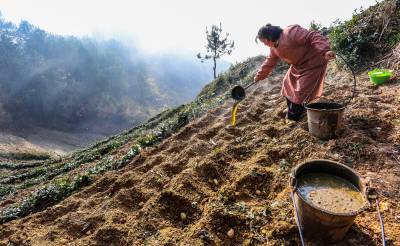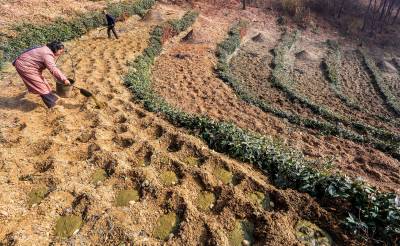 2016年1月15日,竹溪县九里岗林场茶农郑立新、吴秀英等在抢抓无雪雨暖冬晴好天气,在生态茶园茶带间套种土豆。 近年来,竹溪县大力发展养殖业,注重鼓励村民以无公害农家肥为农业生产主肥,商品肥为辅。在提高农业生产质量和产量的同时,又解决了成规模性大量养殖粪便污染环境的问题。农业生产足施农家肥,肥地增产促环保,又为城镇居民提供了大量无公害绿色食品(视界网温大树摄)。