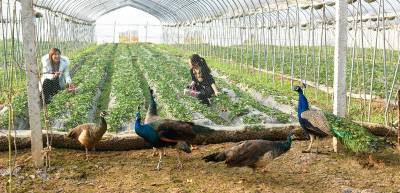 15日,位于嘉鱼县鱼岳镇陆码头村三组的金色田园大棚内,游人采摘草莓,孔雀在草莓园开屏迎游客,令人流连忘返。