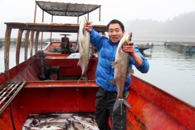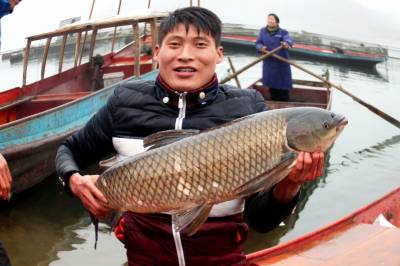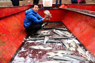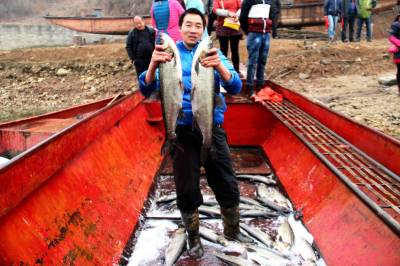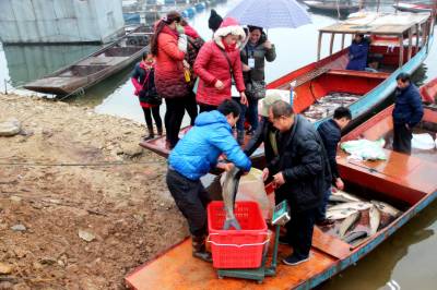 1月16日,丹江口市丁家营镇二道河村的村民在岀售鲜鱼。 随着春节的临近,丹江口市丁家营镇二道河村养植的花白鲢、翘嘴白、草鱼、鲫鱼喜获丰收,村民抓紧时间对二道河原生态放养鱼儿进行捕捞,并现场销售。近年来,当地政府积极引导群众调整产业结构,充分利用天然的屏障,水源充足等资源丰富的有利条件,大力开展特色养殖生产,不仅促进了农民增收,还创出了一条致富路。由于品种优、原生态,吸引了众多游客前来购买,丰收的喜悦映红了村民的笑脸。