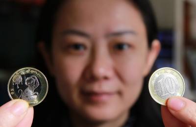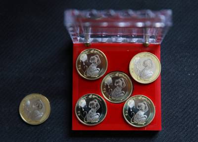1月17日,在襄阳一工商银行网点,一名市民展示刚兑换的猴年贺岁纪念币。当日,中国人民银行发行2016年贺岁普通纪念币一枚,面额10元。该纪念币正面刊“中国人民银行”、“10元”、汉语拼音“SHIYUAN”及年号“2016”,底纹衬以团花图案;背面主景图案为一传统装饰造型的猴子,抬手远眺,其上方为桃形花灯和梅花图案,币面刊“丙申”字样。 (视界网杨东摄)