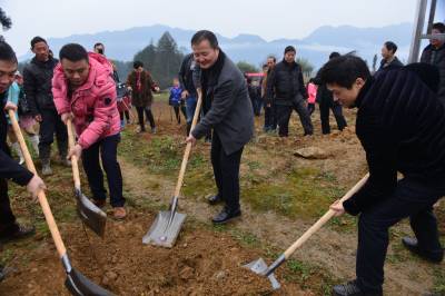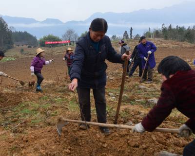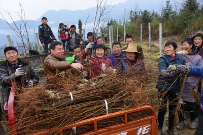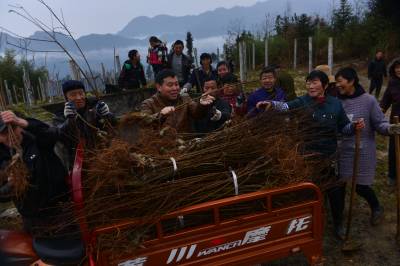1月16日,建始县业州镇当阳村村民“抢”领李子树苗与干群一道冒雨栽植田间。今年,该村引进重庆一家客商进村打造乡村旅游,其间该公司投资帮村民建500亩体验式李子采摘园,走产业扶贫之路,让全村80多户贫困户尽早脱贫。本报视界网刘波摄 建始县新闻中心刘波联系电话13032794298