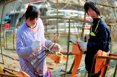 在现场看到,很多大型灯组的主要部位骨架已定型完毕,到处是已经扎成半成品的花灯,正在等待配上外壳、灯具、相关部件等。现场的工人师傅们正紧锣密鼓的忙碌着,几十名工人分工细致,有的在花灯骨架上粘贴锦缎,有的在焊接大型花灯的骨架,装灯泡、裱糊等工序紧张有序地推进。