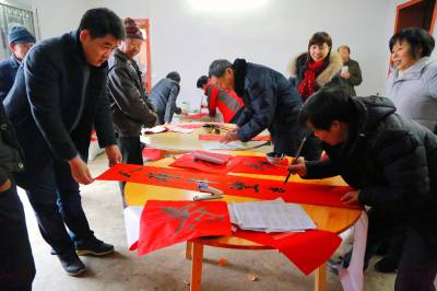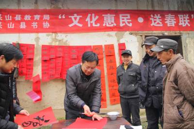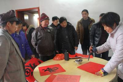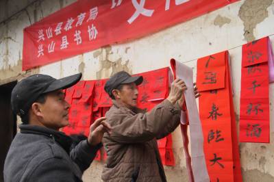 过大年,贴春联是象征吉祥、表达人们向往美好生活的民族风俗,是中华民族一直延续的古老传统。为落实文化惠民精神、丰富山区人民群众文化生活,喜迎猴年新春,县教育局和县书协顶风冒雪走进教育局帮扶村——高桥乡大槽村为该村村民免费书写新春春联,把浓浓的年味儿和新春的祝福送到了贫困户的家门口。