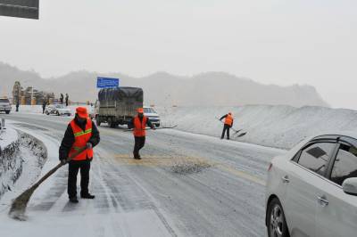 21日上午,笔者在S235省道十两线房县柳树垭路段看到,路面上厚厚的积雪已经被清扫完毕,只剩一层薄薄的冰雪粘合在路面上,养护工人正手拿扫把、铁锹,针对部分影响通行的结冰路段抛洒路面防滑料,县路政大队人员正在险点险段提醒过往车辆前方冰雪路况小心驾驶,并主动帮助他们安装防滑链。据悉,未来几天房县将以多云、晴天为主,部分路段仍有少数冰雪,房县公路局将继续加大路面巡查和处置力度,确保全县道路安全畅通。