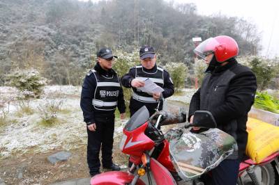 “同志,请戴好头盔,小心驾驶。”1月21日,竹山县公安局麻家渡派出所民警在该镇总兵安村路段一边开展执法检查,一边耐心叮嘱驾驶员。面对低温雨雪天气,为给群众创造安全的出行环境,该所抽调民警、协警、协管员、治保员等,蹲守公路沿线危险路段,加大线路巡守力度,竖立交通警示牌,坚持对驾驶员及乘客进行警示教育、“温馨提示”,全力确保辖区群众出行安全。