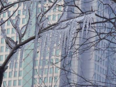> 汉口中山公园假山树枝挂凌冰柱