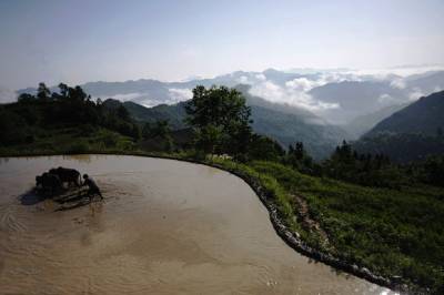 国家政策好农民忙种田6月9日,雨后天晴,竹山县上庸镇九华村农民胡仕财对水田精耕细作,准备载水稻,身后远山的晨雾,如同仙境。胡仕财说,近年来,一部分外出打工者对那些山高路远的水田撂荒,他整理后载上水稻,不但有种粮补贴,自己还能增加收入。这几年,胡仕财整理了7亩多水田,每年净收入有1.3万元。(本报视界网章磊摄)地址:竹山县交通局章磊电话:15972574118