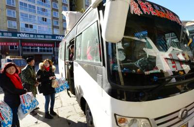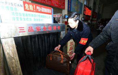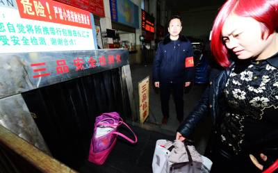 1月24日,工作人员在保康县汽车客运站对旅客携带行李进行“三品”安全检查。 当日,是2016年春运第一天。保康县公安交警、公路客运、运管、路政等部门抽调专人,在车站设立“三品”安全检查专岗,加大对“三品”的检查力度,确保春运安全。(视界网 陈泉霖 摄)