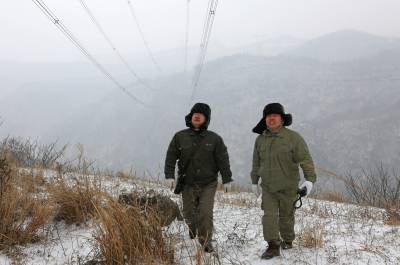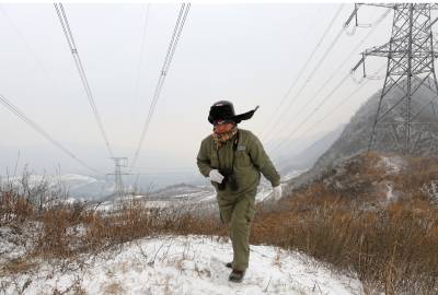 图片场面系检修公司运维人员寒风中在三峡电站部分电力外输超高压线路特殊地带上进行监测和巡察。