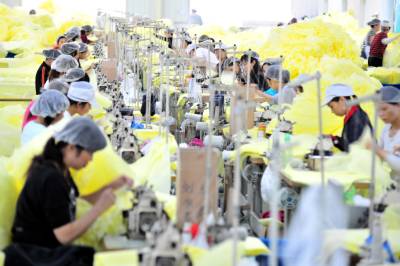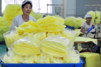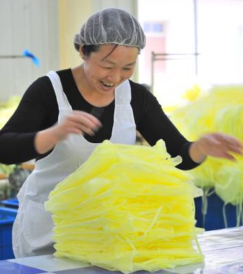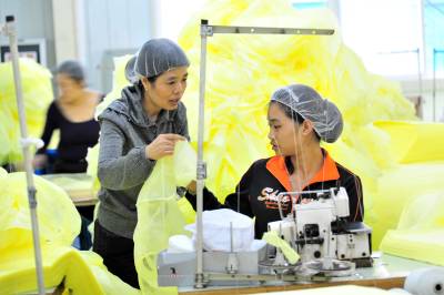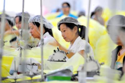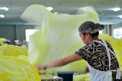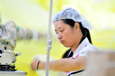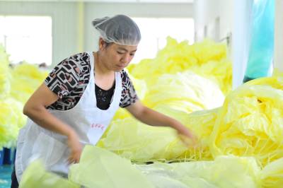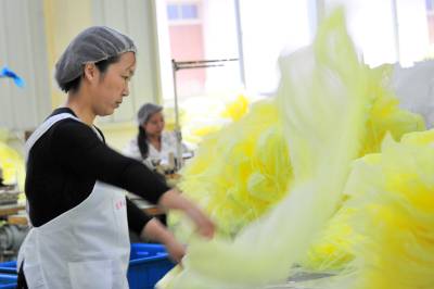 2010年6月8日,位于湖北省宜昌市夷陵区乐天溪镇三峡移民生态工业园的富源医疗器械有限公司生产车间,该镇300多名三峡工程移民正在缝纫加工并整理医用无纺布产品。 今年来,地处三峡工程坝区的宜昌市夷陵区乐天溪镇加快三峡移民生态工业园建设进度,截至5月底已有1800多名三峡工程移民及失地农民在家门口的工业园上岗就业,这些岗位包括食品、造船、玻璃制品、无纺布加工、茶叶加工、食用菌生产、花卉种植等多个行业。本报视界网张国荣摄