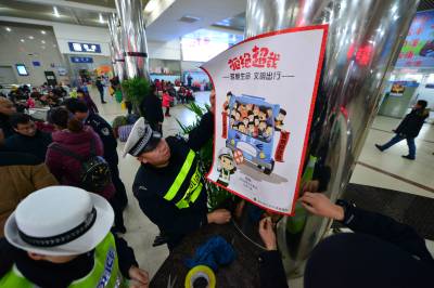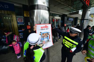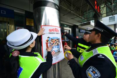 1月27日,襄阳市火车站警务平台民警在长途汽车客运站张贴“平安回家”“拒绝酒驾”“拒绝超载”等卡通样式海报,宣传春运平安出行,受到旅客的欢迎。 视界网 谢勇 摄
