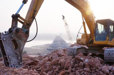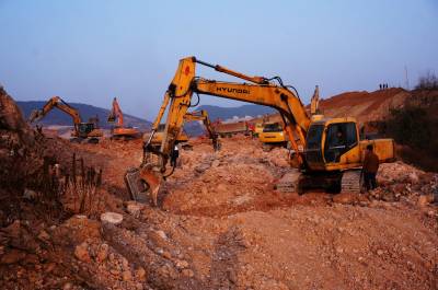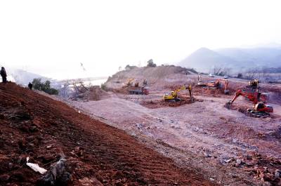 1月29日,各型机械车辆正在十堰市郧阳区沧浪洲汉江大桥工地加快北岸联接线开挖运输建设,郧阳沧浪洲汉江大桥全长1785米,其中大桥与连接线总长为3.15公里,宽26米,双向六车道,工期为36个月,总投资为1.1亿元。 视界网周家山 摄