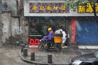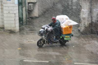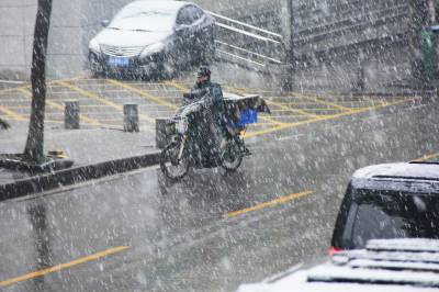 2016年1月31日,在突降的大雪中,邮递员顶风冒雪行进在投递路上。