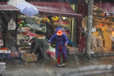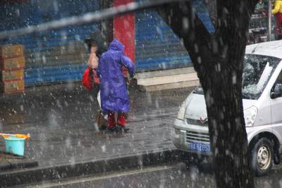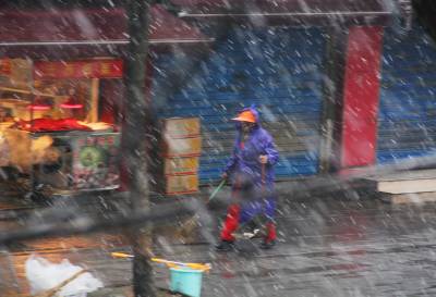 2016年1月31日,在突降的大风大雪中,环卫工人顶着风雪仍坚守在自己的岗位上。