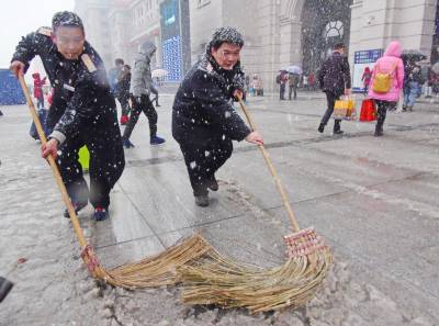 > 武铁汉口站职工顶风冒雪扫雪水 确保春运旅客安全进站