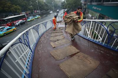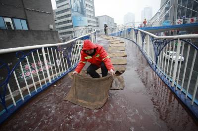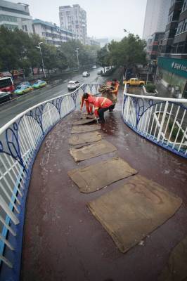 天桥穿上“防滑衣” 1月31日,宜昌城区云集天桥,工作人员冒着寒雪为路面铺设麻袋防滑。为应对雨雪天气,我市相关部门及时调运麻袋、草垫,组织工作人员对人流量大路段进行铺设,确保人民群众出行安全。 本报视界网 黄翔 摄