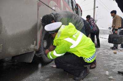 由于冷空气影响,南漳县薛坪、板桥境内部分道路已结冰,为确保安全,交警大队立即通知县客运站停发当日进出薛坪、板桥的客车。随后,交警顶风冒雪,克服天气寒冷、山高路滑等困难,到薛坪、板桥开展交通安全检查和交通安全宣传,对未安装防滑链的车辆一律禁行,并科学引导车辆安全通行。