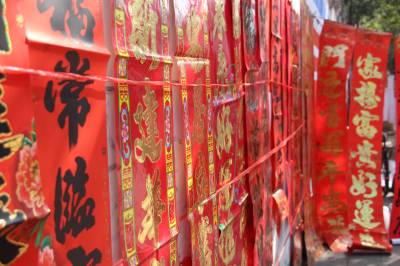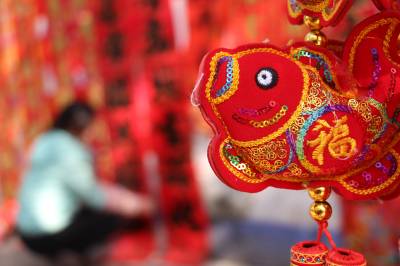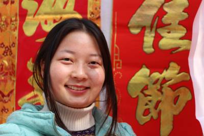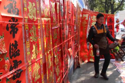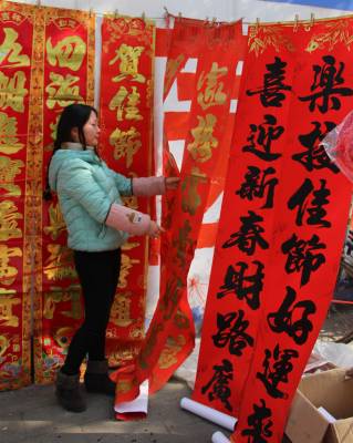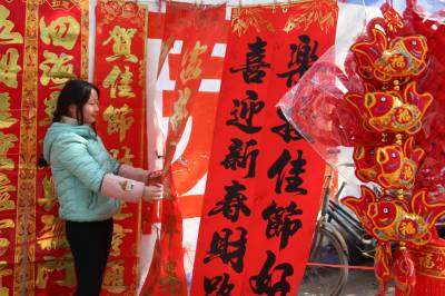 2016年2月4日,一名回乡同家人团聚过年的云梦籍大三学生同弟弟一起来到市场,销售春联、年画、吉祥物等年货,热情接待客人,享受节日的乐趣,受到客人的喜爱和欢迎。