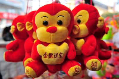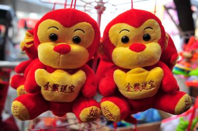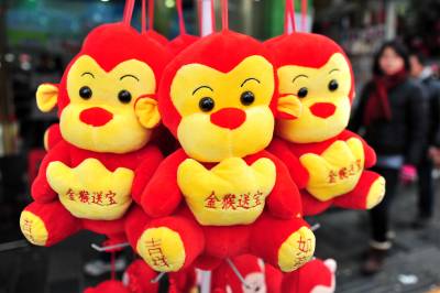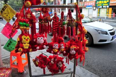 2016年猴年春节到来,在宜昌市夷陵区街头,迎春过年的氛围日渐浓厚,金猴送宝的“猴宝宝”饰品格外引人注目,处处充满喜庆氛围。视界网 张国荣 摄
