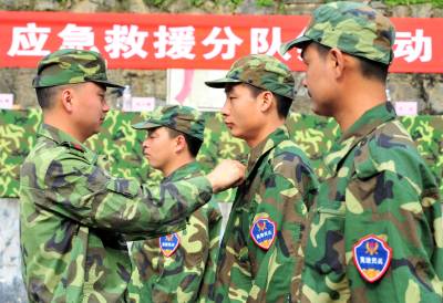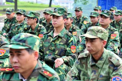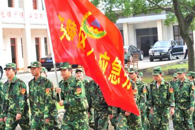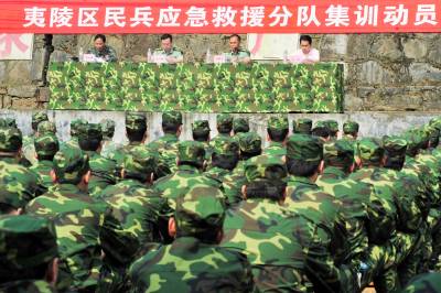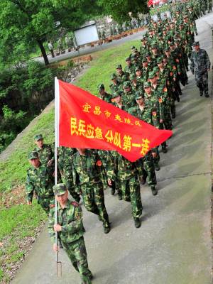 2010年6月10日,湖北省宜昌市夷陵区组织民兵应急救援分队开展集中训练活动,在5天集训时间里,120名应急救援队员将进行拉练、队列训练,培训抢险救灾、应急救援专业技能和形势备战教育,以全面提高民兵应急救援分队应对当前防汛抗灾和抗洪抢险的作战能力,为随时完成应急救援任务打下坚实基础。本报视界网张国荣摄