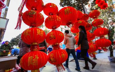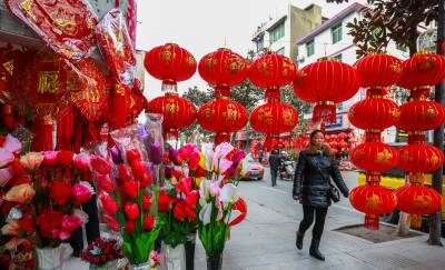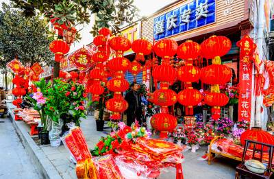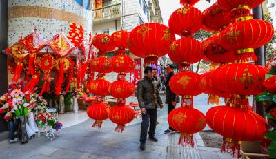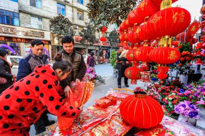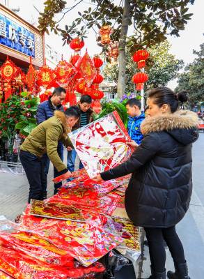 :2016年2月6日,湖北竹溪大街小港一片顾客欢欢喜喜选购春联、年画、红灯笼辞旧迎新喜庆氛围。 春节临近,湖北竹溪大红灯笼、春联、年画满街挂,如潮辞旧迎新顾客选购新年新心愿(视界网温大树)。
