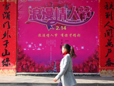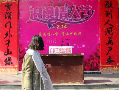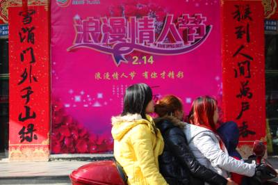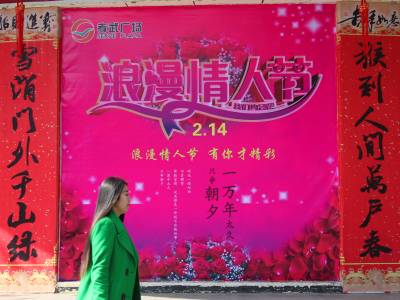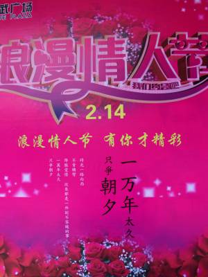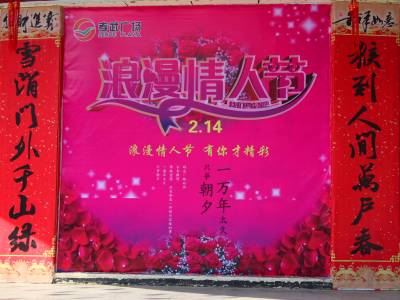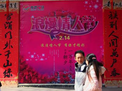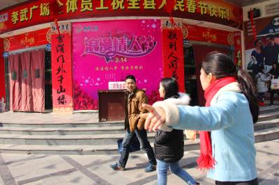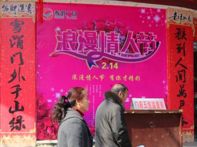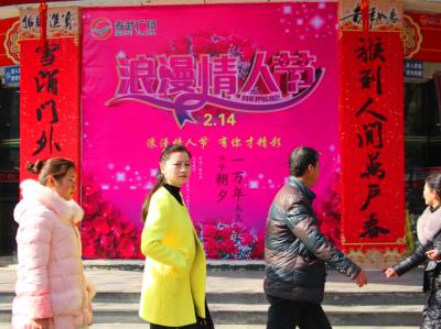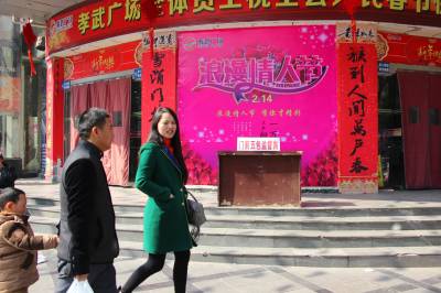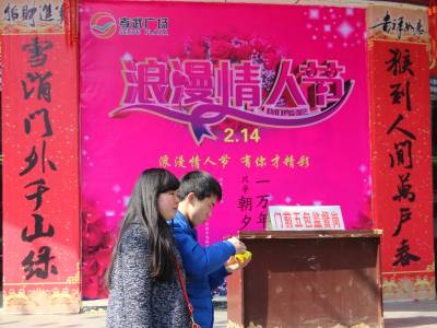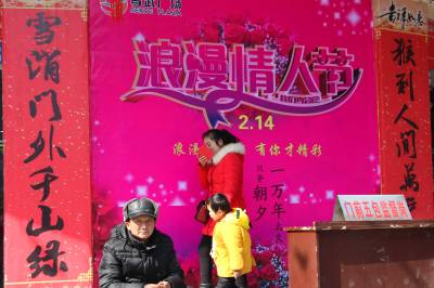 2016年2月7日,云梦县一家商场前“情人节”商战的巨幅宣传吸引人们瞩目观看。“春节”连着“情人节”,传统节日遇上洋节,各商家使出浑身解数,送走农历羊年,迎来猴年新年,紧锣密鼓打起春节、情人节的商战,情人节商战已经悄悄拉开序幕。本报视界网 陈保忠 摄