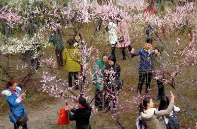 2月12日是猴年正月初五,游客在武汉市汉阳归元寺赏花观景留影。