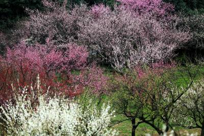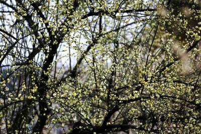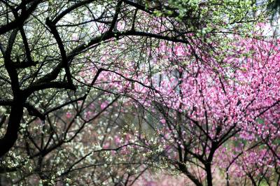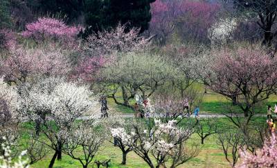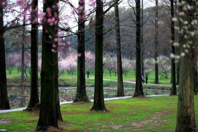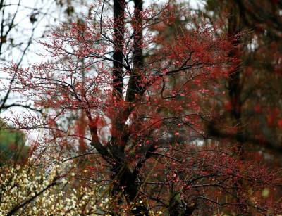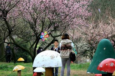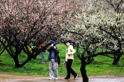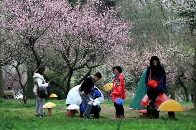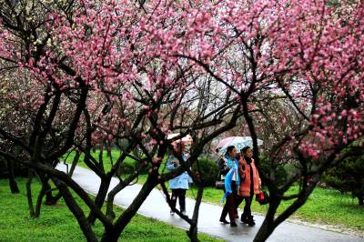 2016年2月12日,武汉东湖梅园里的各种梅花竞相开放,为猴年春节增添节日气氛。图为来自省内外的游客冒雨赏花的情景。邱泽宝摄