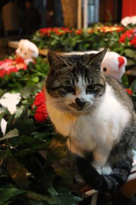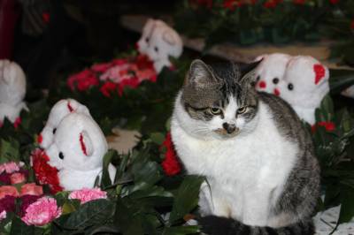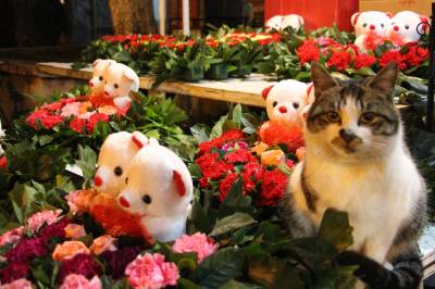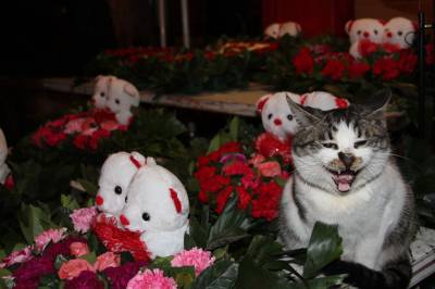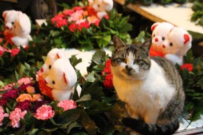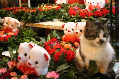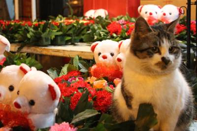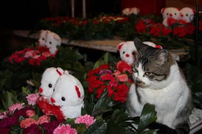 2016年2月12日,一只逗人喜爱的猫咪在云梦城一鲜花市场蹲坐在花丛中,与鲜花、宝宝熊浑然一体,动中有静,静中有动,动物、鲜花、玩具熊相互辉映,格外有趣有味,让人忍俊不禁看不够。当日正值农历猴年正月初五,又值情人节即将到来,爱花猫咪花丛中卖萌,给节日的人们带来乐趣,给情人节带来温馨和情趣,引众多客人围观。