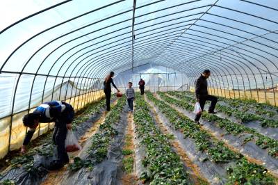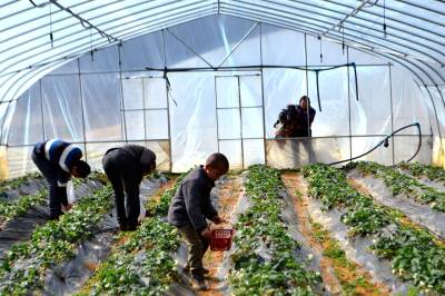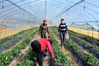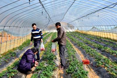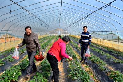 无激素草莓俏销 15日,游人在采摘草莓。 巴东县官渡口镇返乡青年胡刚在该镇沙坪村租赁土地80亩,办起家庭农场,修建40个大棚,种植草莓,已进入丰产期,春节前后上市。由于该草莓种植不施化肥,不喷洒农药,无公害、口感特好,吸引大批消费者。以每斤50元的价格销售还供不应求,只好实行预定销售。(视界网向国大摄)巴东县官渡口镇东坡小学