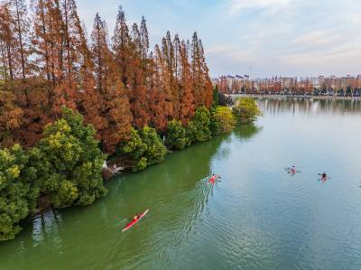 初冬时节,湖北省襄阳古城护城河畔层林尽染,色彩斑斓,运动员们驾小艇泛舟于护城河碧水之中,灵动身影与古...