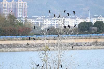 当日在汉江丹江口水库湖北省十堰市郧阳区柳陂镇福银高速出口湿地拍摄的候鸟。每到初冬季节,大批候鸟飞临郧...