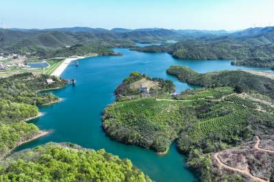 2026年4月12日,三峡库区湖北省宜昌市秭归县归州镇彭家坡村,脐橙园的观光廊道与吒溪河的绿水青山相...