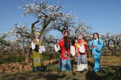 2026年3月28日,戏曲工作者走进湖北省枣阳市太平镇张柏岗村百亩梨园为游客演唱传统戏曲《梨园春》。...